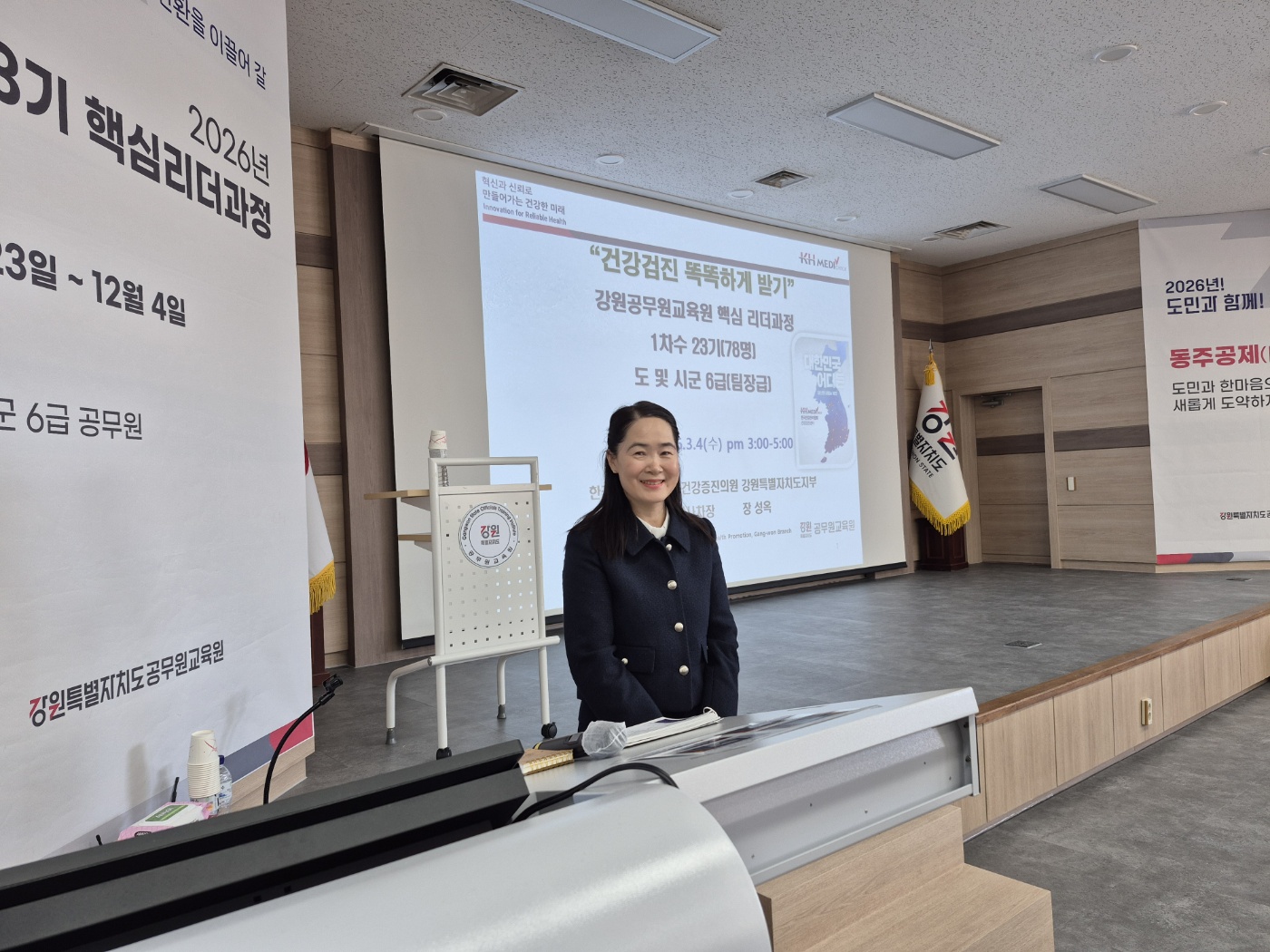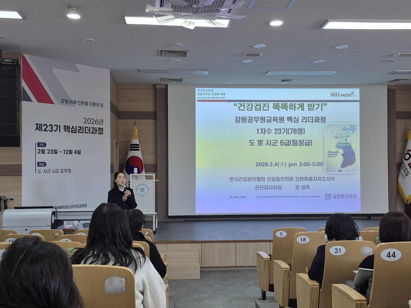 한국건강관리협회 강원특별자치도지부(본부장 고복희)는 3월 4일(수) 강원특별자치도 및 시·군 6급 공무원을 대상으로 진행되는 핵심리더과정에서 지난해에 이어 올해도 강의 요청이 있어 건강검진 강의를 진행했습니다.